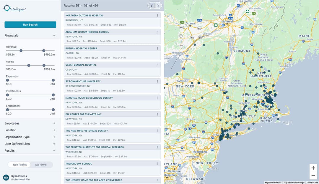 Find, vet, and research nonprofit organizations that fit your client profile. All the tools you need without spreadsheets or the need for an internal data guru.